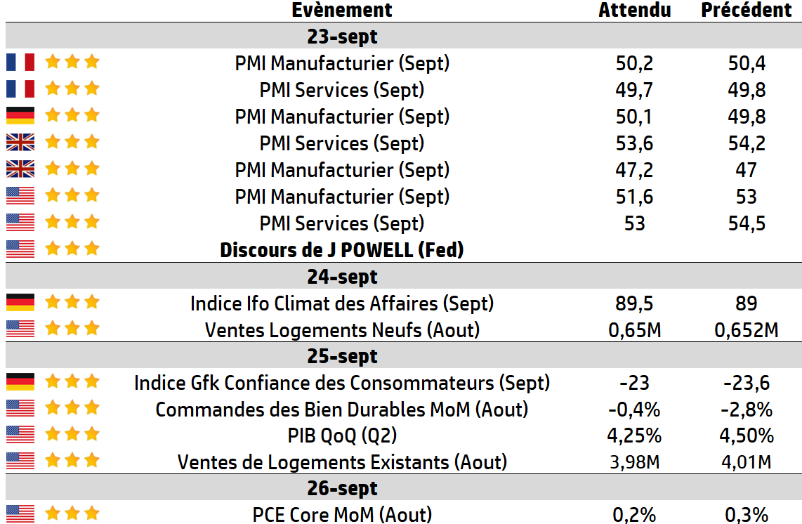 Une bonne moitié du CAC40 dont les stars du luxe Hermes et Kering, les équipementiers automobiles Forvia et Michelin publieront leurs résultats. Aux USA les entreprises technologiques US dominent la semaine. Netflix, Tesla et Amazon constituent la première vague des membres à forte capitalisation du Magnificent 7, mais d’autres entreprises comme le géant pétrolier Halliburton et l’entreprise de défense Lockheed publient également leurs résultats. Au Royaume-Uni, Unilever et InterContinental Hotels, entre autres, publient leurs résultats commerciaux.