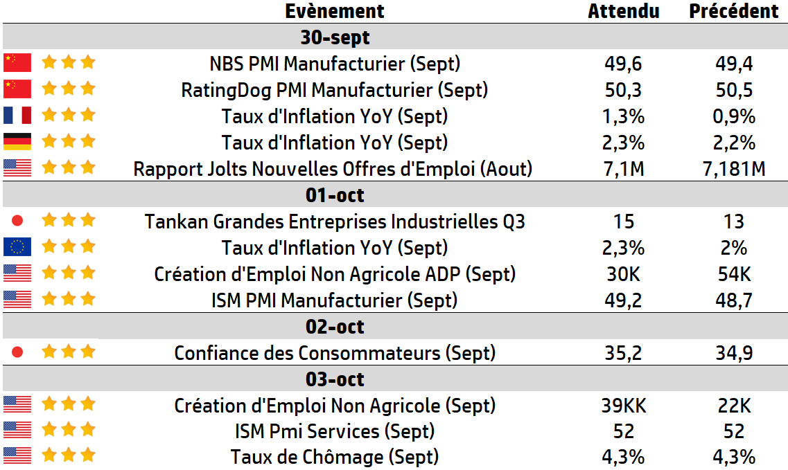 Les chiffres de l’emploi aux États-Unis (ADP & NFP) seront avec les PIB Européens les chiffres importants, mais la confiance des consommateurs américains et l’indice des directeurs d’achat chinois (PMI) seront également à surveiller.