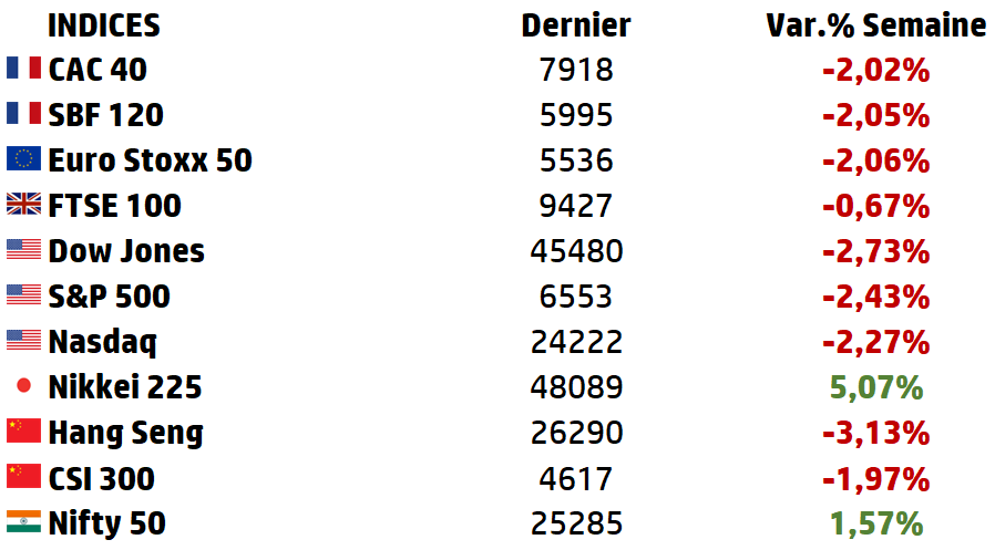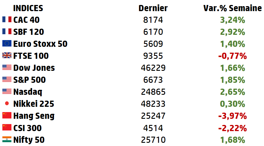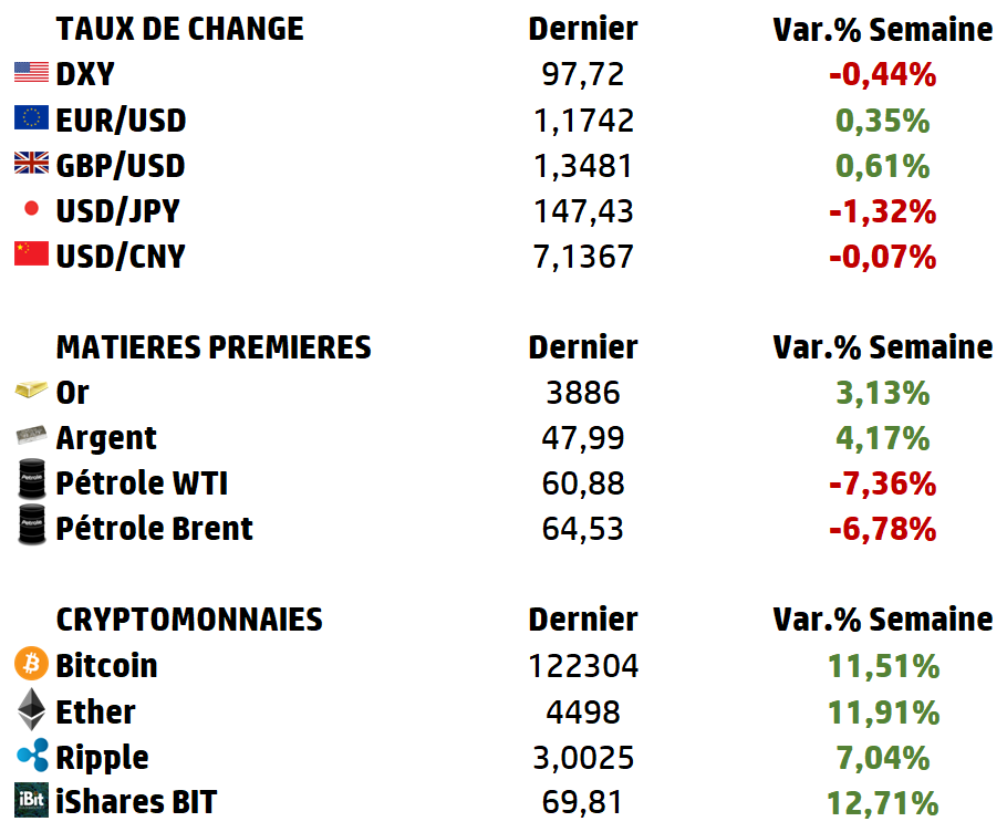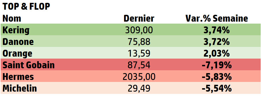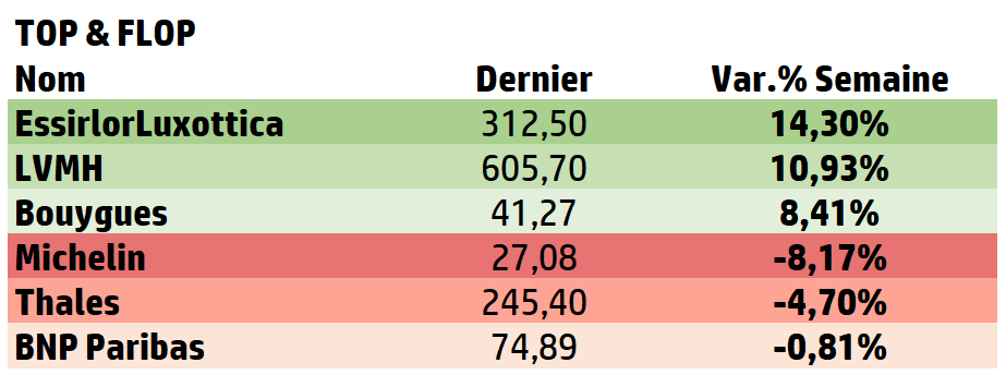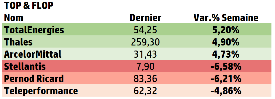 La semaine sera à nouveau chargée en publications de bénéfices français, américains et britanniques avec en autre les bénéfices des banques françaises et britanniques, de TotalEnergies, Stellantis, des deux géants pharmaceutiques britanniques, ainsi que ceux d’Amazon, d’Apple, de Meta et de Microsoft.