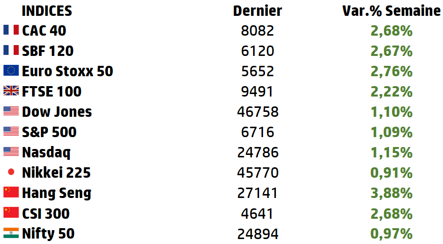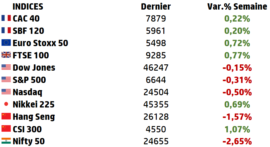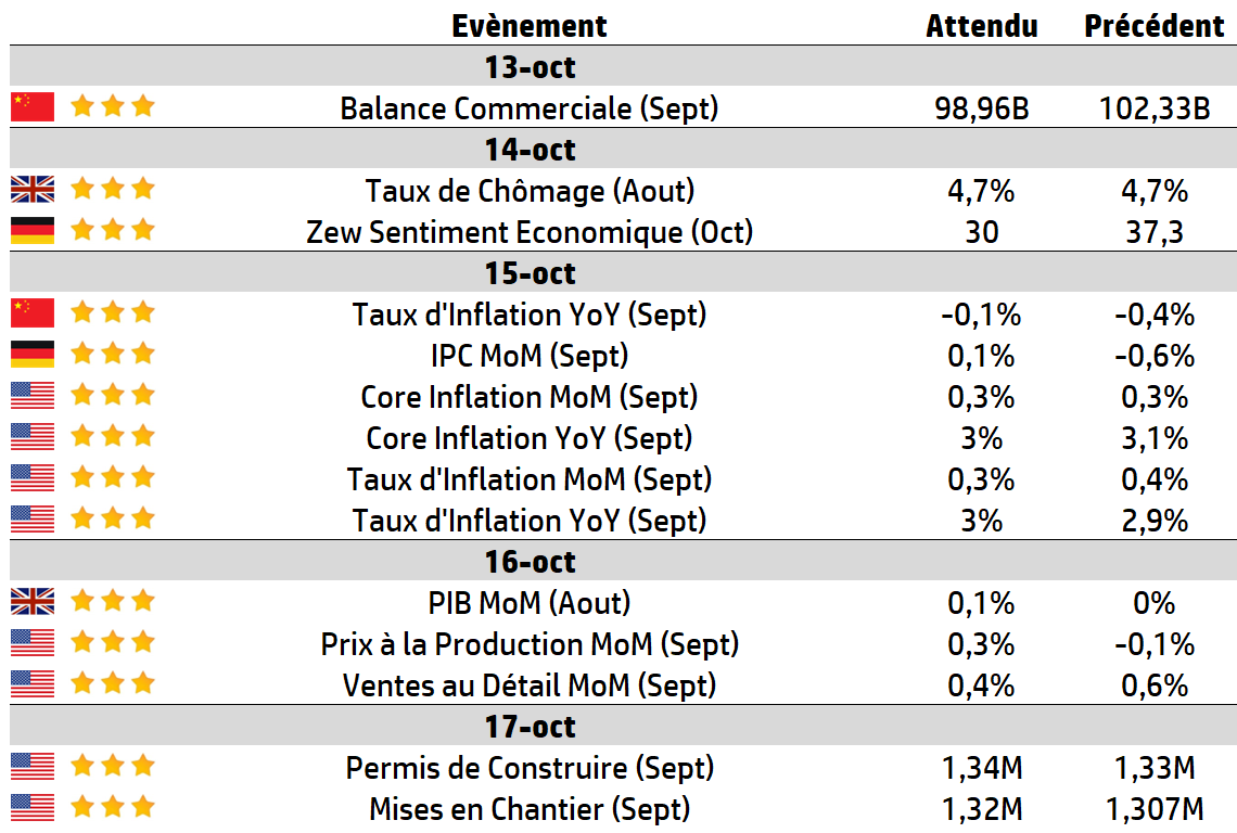 Le shutdown du gouvernement américain se poursuit, mais la semaine prochaine marquera le début de la saison des résultats avec la publication des derniers chiffres de Delta Air Lines. BlackRock suivra, puis les banques américaines publieront leurs rapports la semaine prochaine.