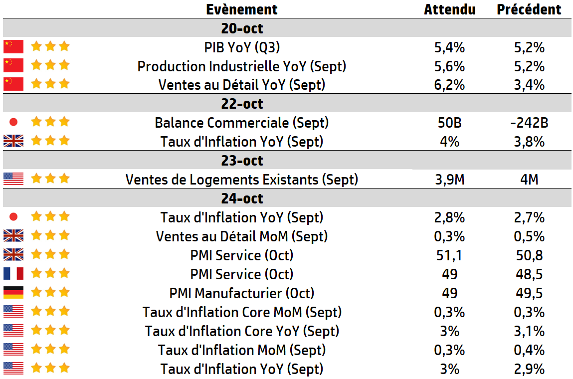 Le PIB Chinois et les données sur l’inflation, au Royaume-Uni, au Japon et aux États-Unis seront également publiées, ces dernières ayant été retardées en raison de la fermeture du gouvernement. La prochaine décision de la Réserve fédérale (Fed) est prévue dans un peu plus d’une semaine, ce rapport devrait donc jouer un rôle clé dans les délibérations du comité de la Fed.