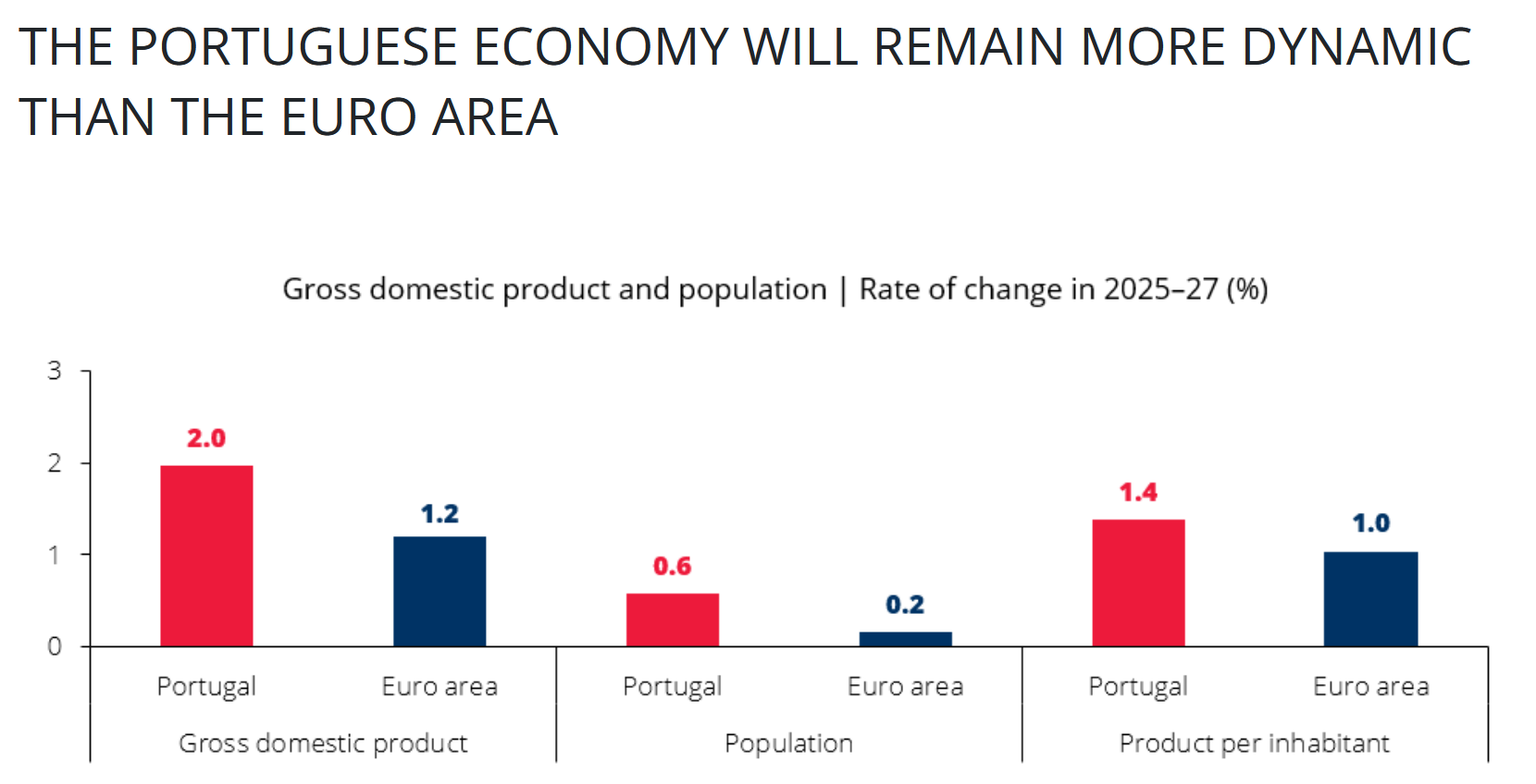 ➡️ Le PIB continue de progresser à un rythme solide : +1,9 % en 2025 selon le Boletim Económico du Banco de Portugal, après +2,1 % en 2024 et une prévision de +2,2 % pour 2026.