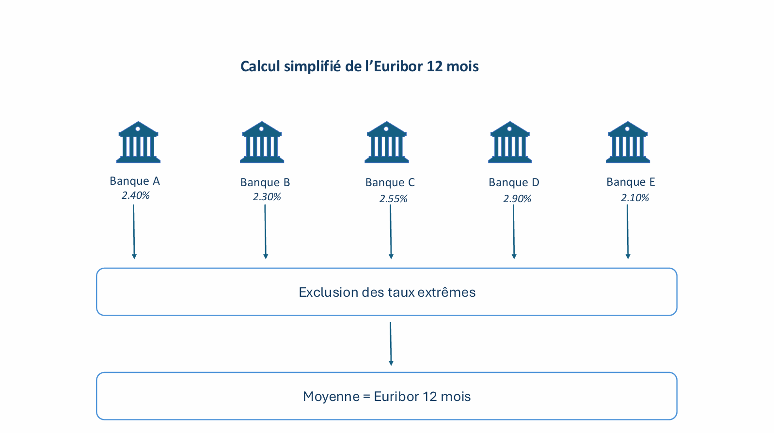 L’EURIBOR est calculé à partir des taux proposés par un panel de grandes banques européennes, qui indiquent à quel taux elles seraient prêtes à prêter à d’autres établissements sur le marché interbancaire. Le taux à 12 mois correspond à une échéance fixe d’un an.
