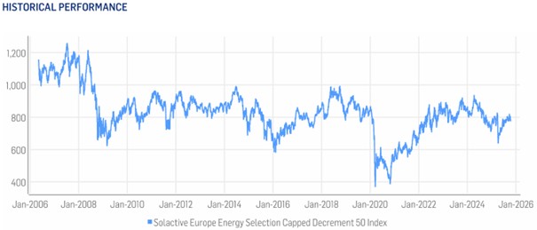 Il comprend les plus grandes sociétés énergétiques cotées en Europe, et applique un plafonnement de la pondération individuelle de chaque composant pour assurer une diversification équilibrée. De plus, l’indice utilise une méthode dite « decrement », qui simule un rendement net de dividende en le déduisant de la valeur de l’indice. L’indice est ajusté d’un dividende synthétique fixe de 50 points de base par an.